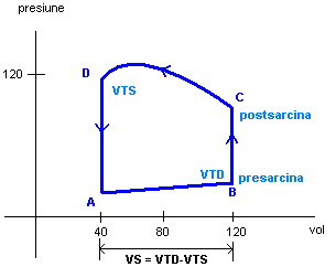 - AB: umplerea ventriculară, cuprinsă între M(d) şi M(î), creşte volumul ventricular iar presiunea foarte puţin (datorită complianţei crescute). La final în ventricul avem un volum de sânge = VTD.