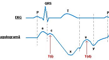 - <x> - corespunde ejecţiei VD şi prin tracţionarea în jos a planului ventil al inimii scade presiunea atrială, scădere reflectată retrograd şi în vena jugulară; unda x este sincronă cu unda pulsatilă arterială