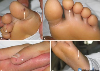 Ieșirea din relieful pielii, caracterul dureros sau nu, precum și localizarea (palmo-plantară sau la vârful degetelor) face diferența între cele 2 leziuni. Leziuni similare au fost descrise în lupus, gonococcemie, endocardita marantică, febra tifoidă sau infecția de cateter.